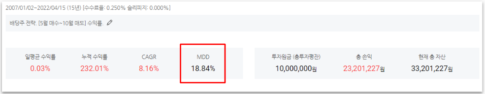 (이는 개인의 성향에 따라 선택하면 된다. 큰 손실도 견딜 수 있는 멘탈이라면 장기적으로는 투자를 쉬지 않고 계속 하는 게 더 이익이긴 하다. 문제는 큰 손실에 멘탈이 못 견뎌서 결국 전략에 여기저기 손 대다가 투자 전략 전체를 망쳐버리는 일이 생긴다는 것. 견딜 수 있을 것 같지만, 쉽지 않은 일이다. 실제로 투자하지 않고 백테스트만 할 때도, 1년동안 발생한 이익을 바로 다음 해에 고스란히 까먹는 것을 보자 견디기 힘들었다. 괜시리 사람들이 MDD 줄이려고 노력하는 게 아닌 것.)