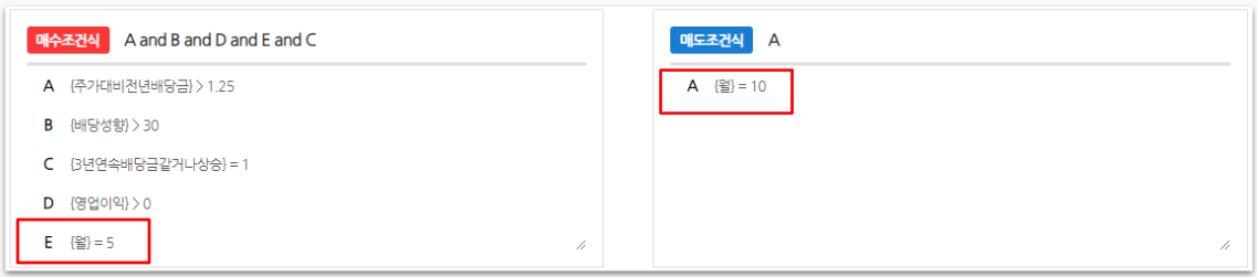 *매수 조건에 [{시가총액} > 0.1]는 시가총액 낮은 기준으로 정렬되는지 확인하기 위해 추가. 없어도 상관 없음.*