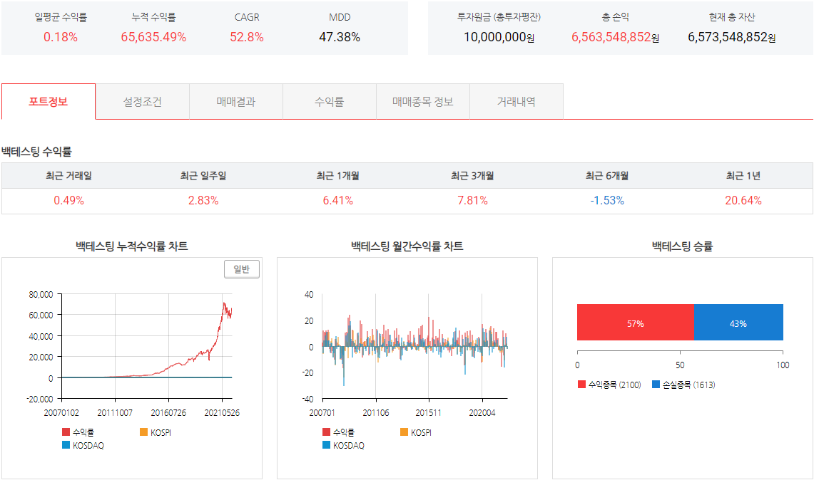 벡테스트 결과 1개월마다 유사 리밸런싱을 해주는 것이 가장 결과가 좋았다.([유사 리밸런싱]은 모든 종목을 팔고, 순위에 따라 다시 사는 것을 말한다. 이는 젠포트의 백테스트 구조 상 리밸런싱이 불가능해서 벌어지는 일이다. 실제로 투자할 때는 정석대로 리밸런싱하면 된다.)